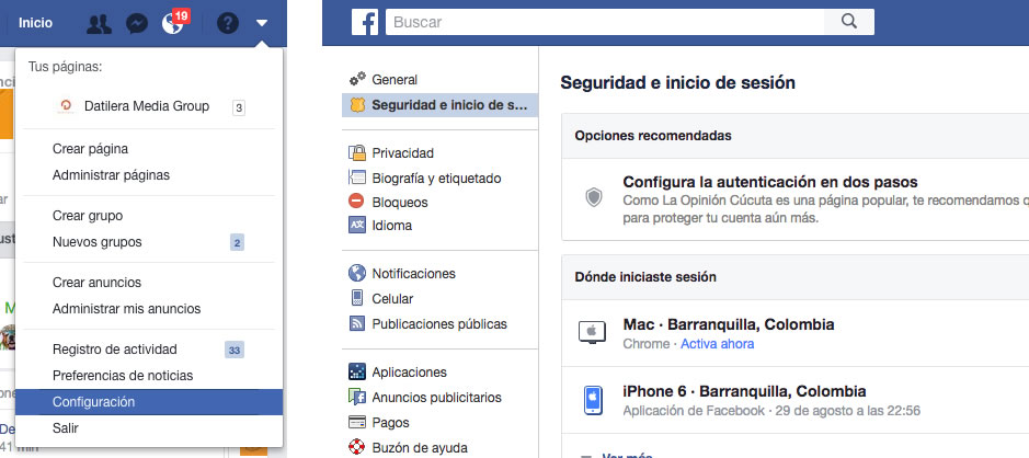 1. Una vez ingresado a tu perfil en Facebook, ubica a mano derecha la punta de una flecha y da clic donde dice "configuraciones" y lee detenidamente a que cosas le estás dando autorización, recomendamos mirar bien: Seguidad, privacidad, biografia/etiquetado y bloqueos.