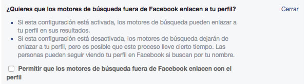 Desactiva la función ¿Quiere que los motores de búsqueda fuera de facebook enlacen a tu perfil?