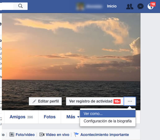 6. Verifica como ven tu perfil otras personas. Ve a tu perfil y luego selecciona unos puntos ubicados a mano derecha (actividades) y da clic en "Ver como".